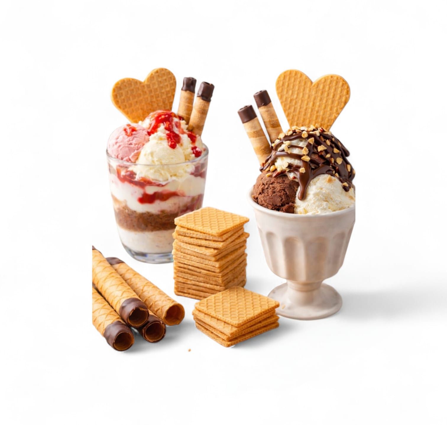 Fabricamos conos, galletas, obleas y barquillos de alta calidad, además de salsas y toppings ideales para realzar tus postres y helados.